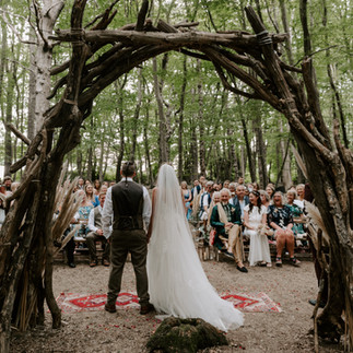 The stunning wedding arch, foraged from the woodland, created the day before the wedding by Lily and Dean's family.