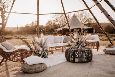 Our Tipi Interiors offer a wide selection of unique furnishings, which will bring a boho-chic, festival vibe, to your wedding or party.